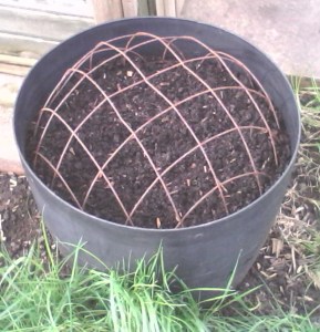 I had hoped to keep the pot of English daisies I had last year going through the winter but that wasn’t to be so I’ve started again. Last week I noticed some on one of the plot paths, and yesterday when I had a closer look found a suitable plant which I dug up and bought home. It’s very small so I planted it in a 2.5 in/6.5 cm terracotta pot. As you can see it’s already got one flower, with a bud nestling in the leaves.
