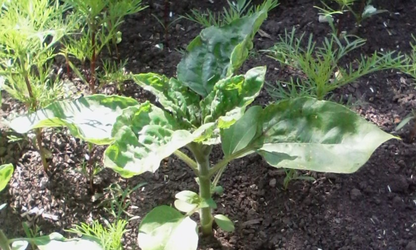 I had hoped to finish sowing the annual flower seeds during the week but it was too windy so I’ll do that next week. The self-seeded ones are appearing all over the flower patches and include this sunflower which I had to move as it had appeared in a totally unsuitable place.