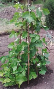 Earlier in the year I had twelve runner bean seeds Moonlight and as I only wanted six plants sowed two per cane around the bamboo cane wigwam. Ony three seeds germinated and grew but thankfully they’re doing well, and I’ve got runners up each of the six canes most of which are already near the tops so I’ll pinch them out next time I’m there.