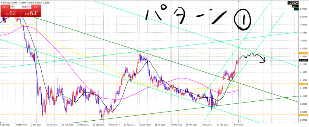 新しく引いた2020年3月起点のトレンドラインに沿ってもっとゴリゴリ上げていき、1.3くらいまで上げるのではないかというパターンです。