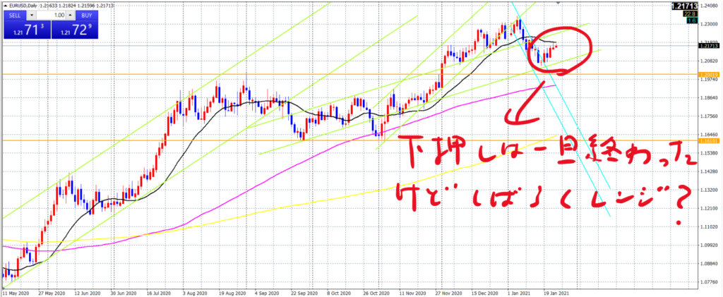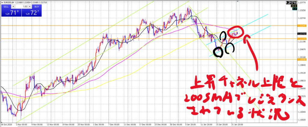 今この記事を書いている時点(1/25 19時頃)で、1.214台まで下押ししてきました。水色の上昇チャネル上限と200SMAでレジスタンスされて下に押してきました。