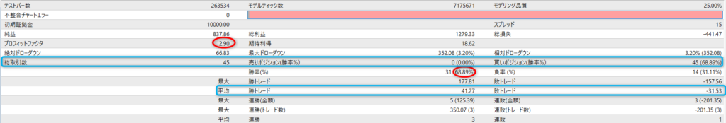 プロフィットファクターはなんと2.23と大幅に改善しました。まあ上昇トレンド中にロングしかしない設定を後付けでしてるんだからそりゃそうなりますよねって話ではあるのですがw