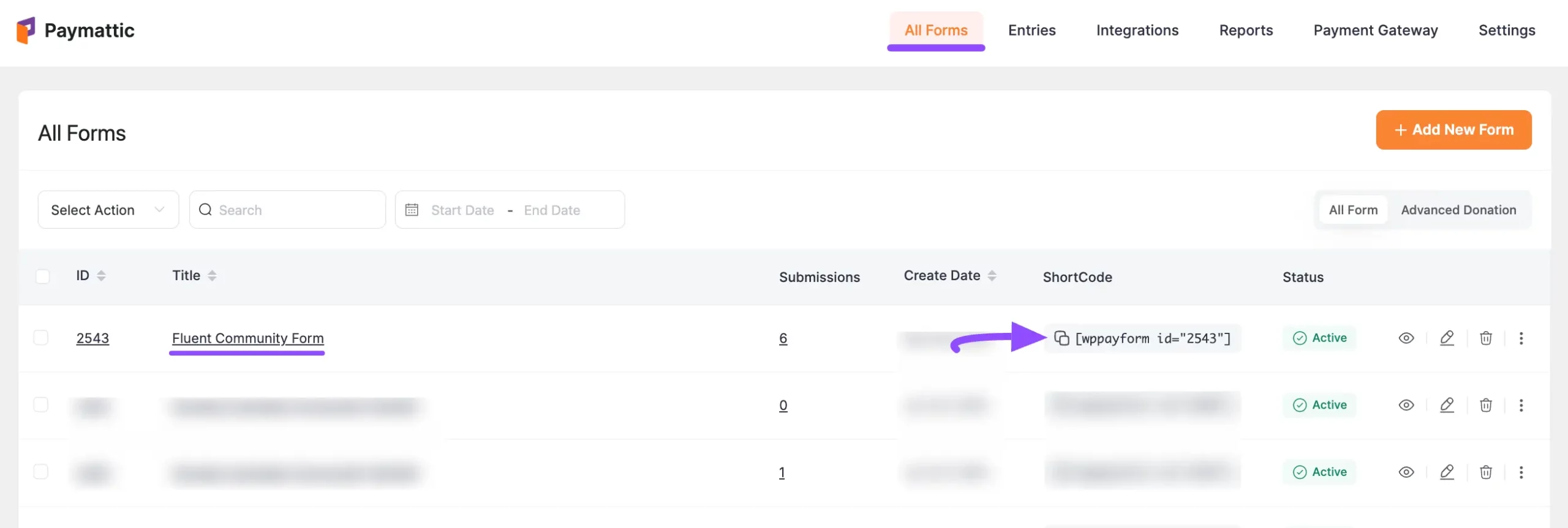 Now, go to All Forms, open an existing form by clicking the Pencil/Edit Icon, or create a new form by clicking the + Add New Form button to integrate FluentCommunity.