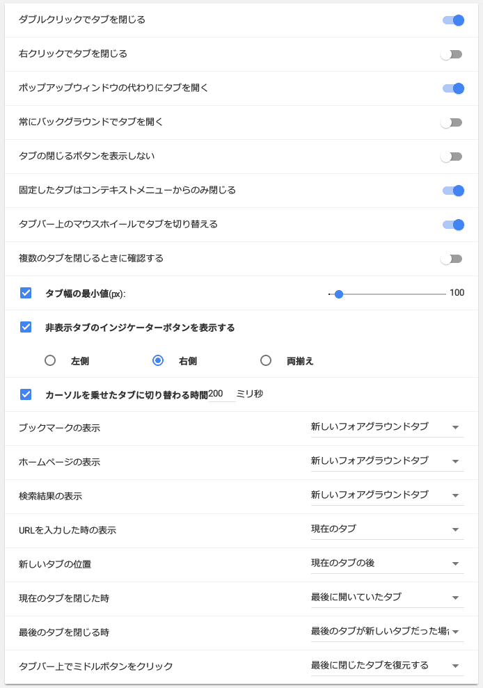 他にもブックマーク、ホームページ、検索結果を開く時の動作を変更(新規タブで開く、既存タブで開く)できたり、新しいタブを開いた時の表示位置も変えることができます。
