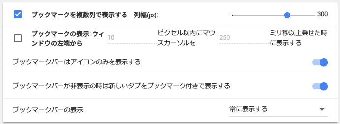 ブックマークバーのサイトはアイコンのみ表示(ファビコンのみ)もできます。
