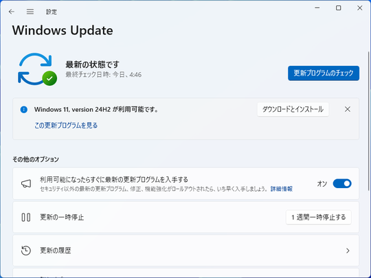 なお、アップグレードの提供は段階的に拡大される。対象となるまでには多少時間がかかるので注意したい。興味のあるユーザーは、「設定」アプリの[更新とセキュリティ]-[Windows Update]ページで[利用可能になったらすぐに最新の更新プログラムを入手する]オプションをONにし、手動で[更新プログラムのチェック]ボタンを押すとよい。デバイスがアップグレードの配信対象となっていれば、「Windows 11、バージョン 24H2の機能更新プログラム」のダウンロードとインストールが案内される。