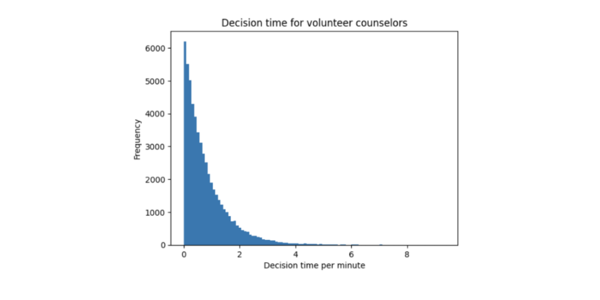 In our agent-based simulation, both support seekers and volunteer counselors have the possibility of being matched during each “round” or simulation period. We determined that a simulation period of 1 minute was fit for our model as 1 minute is temporally granular enough to yield quick matching of users and derivable from our empirical data.