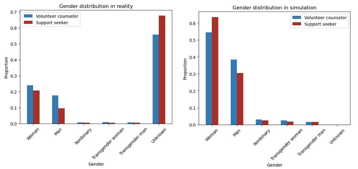 We also compared the proportion of support seekers who were matched with a volunteer counselor to the total number of support seekers available to be matched. Note that support seekers may cancel their chat request if they are unmatched for longer than their patience level. To evaluate the ground truth, we analyzed the proportion of chats taken by volunteer counselors on the research site to the total number of requests by support seekers in the research site queue. We found that our simulation resulted in an overall 78.35% matching rate in a week, whereas the ground truth showed an average of 83.27% matching rate across all weeks in our data set. Although our simulation’s matching rate was slightly lower than that of the ground truth, the likely explanation is that our simulation framework only allows support seekers and volunteer counselors to engage in one chat at a time, whereas the research site allows volunteer counselors to take multiple chats at once if they desire. Given this, we found that our simulation’s matching rate was acceptable and still closely resembled the actual state of the research site.
