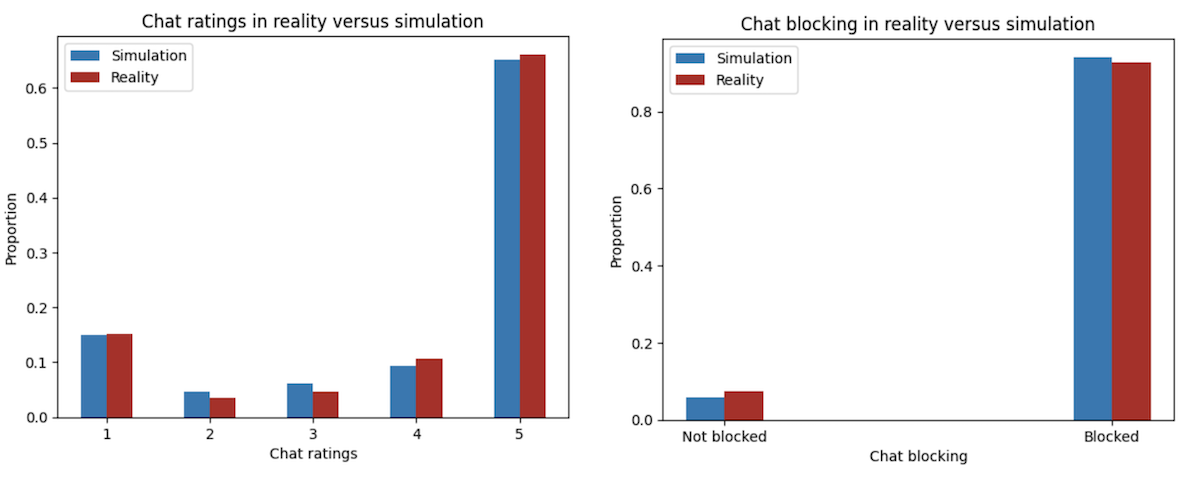 We used our chat rating prediction model to compare the distribution of chat ratings between our simulation and the ground truth. We found that we accurately simulated rating distributions on the research site, with a Pearson correlation coefficient of 0.99 between our replication and the ground truth (). Similarly, we validated our replicated system using the blocking prediction model. Using the blocking prediction model, we found similar distributions of pairs that engage in blocking to those in the ground truth, with a Pearson correlation coefficient of 0.949, as shown in , leading to further confidence that our simulation is an accurate representation of the current platform’s system.
