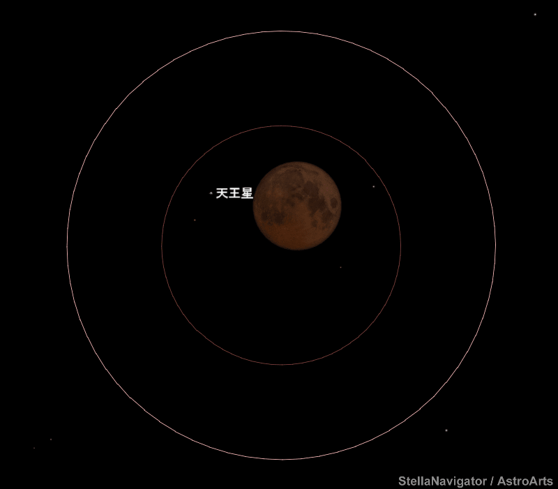 場所によってはギリギリ皆既中の月が天王星を隠す「天王星食」が起こります。