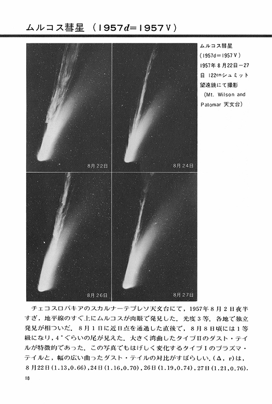 1956年に発見されたアラン・ローラン彗星(当書での表記はアラン・ロラン彗星)です。2番目に掲載された写真のとおり、尾の一部が太陽の方向に伸びて見える〝アンチテイル〟が観測されたことで有名な彗星です。地球と彗星と太陽の位置関係により、彗星の尾のうちのダストテイルが見掛け上で通常とは逆向きに細く伸びて見える時期があったとのこと。最大光度の記述はありませんが、0等まで明るくなったらしいです。