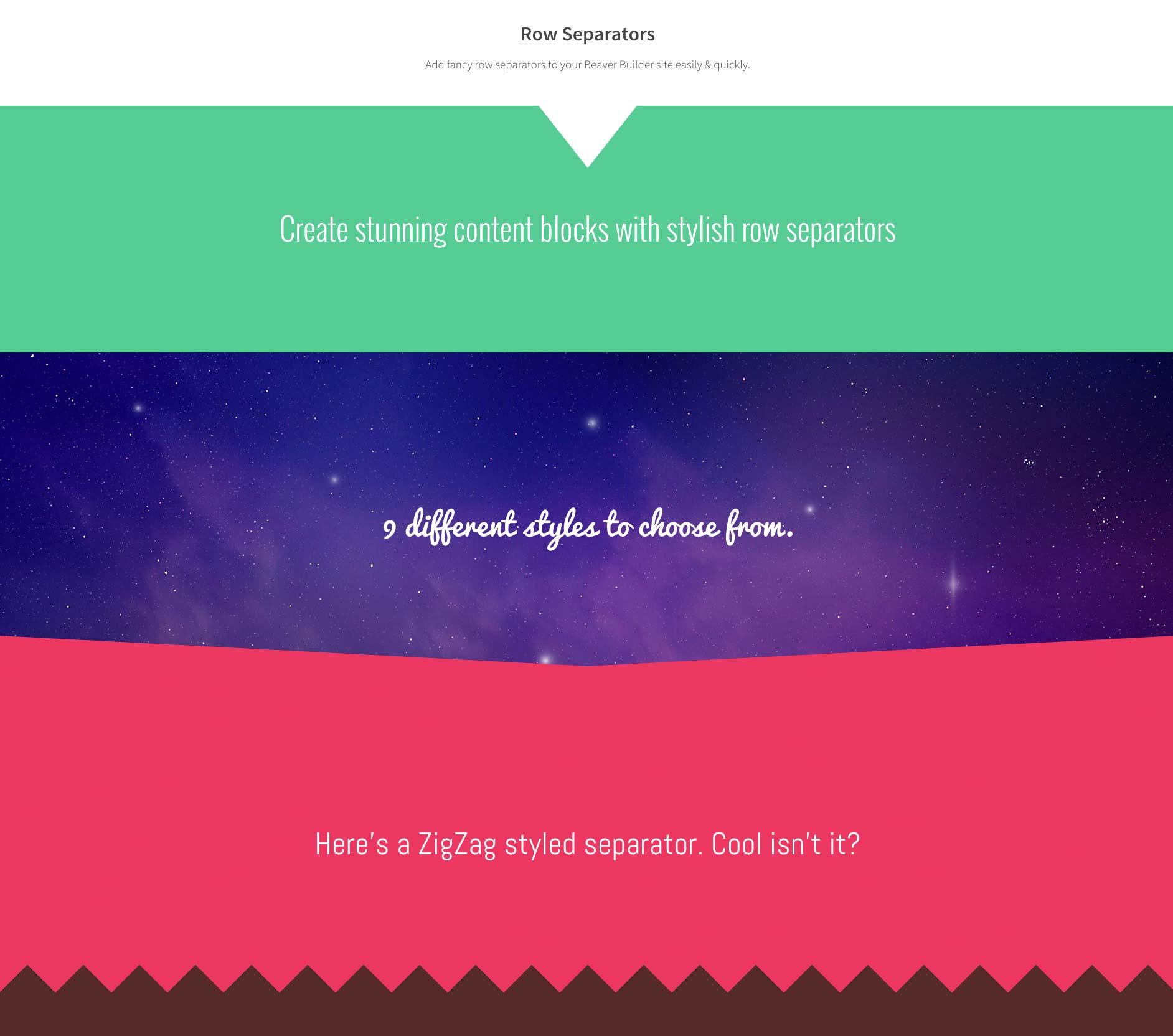 - Row Separators: A creative module that allows you to add fancy row separators to your Beaver Builder site and make it look more spectacular and appealing. You can use Tilt, Big Triangle, Triangle Left, Triangle Right, Small Triangle to add nice section breaks on your site.