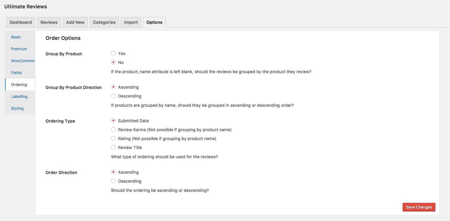 - Currently you can choose between ascending or descending ordering by either Submitted Date, Rating or Review Title. You can also group your reviews by product with the ability to order them (ascending or descending) by product name.