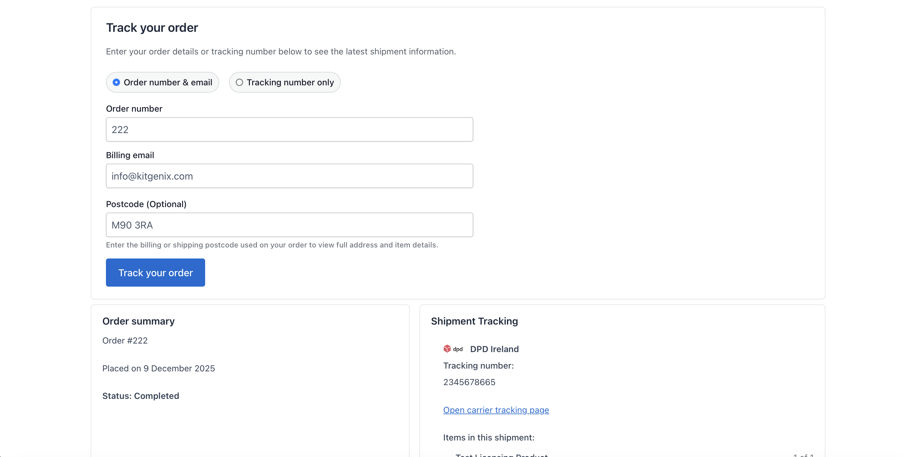 You can add multiple tracking numbers to an order (perfect for split shipments, replacements, multi-parcel deliveries, or using different carriers), show a customer-friendly tracking view, include tracking in key WooCommerce emails, and offer a self-service tracking page to reduce support tickets.