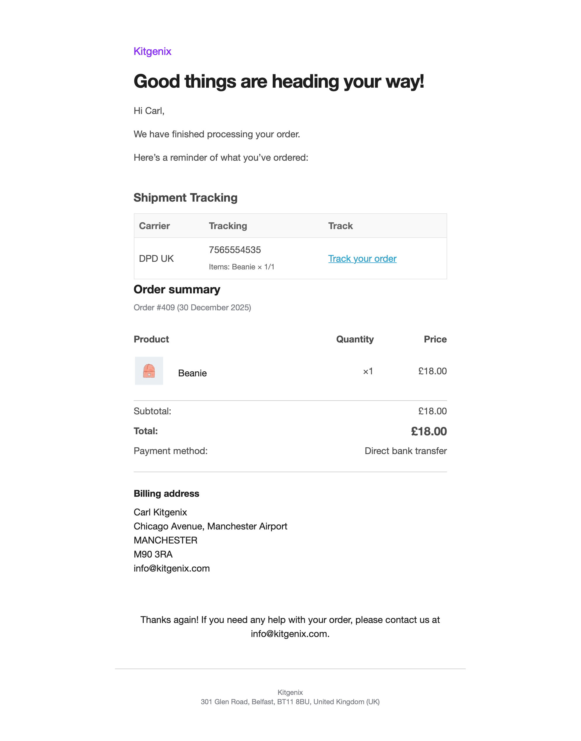 If tracking exists, customers see a clear “Shipment Tracking” section in key order emails. -