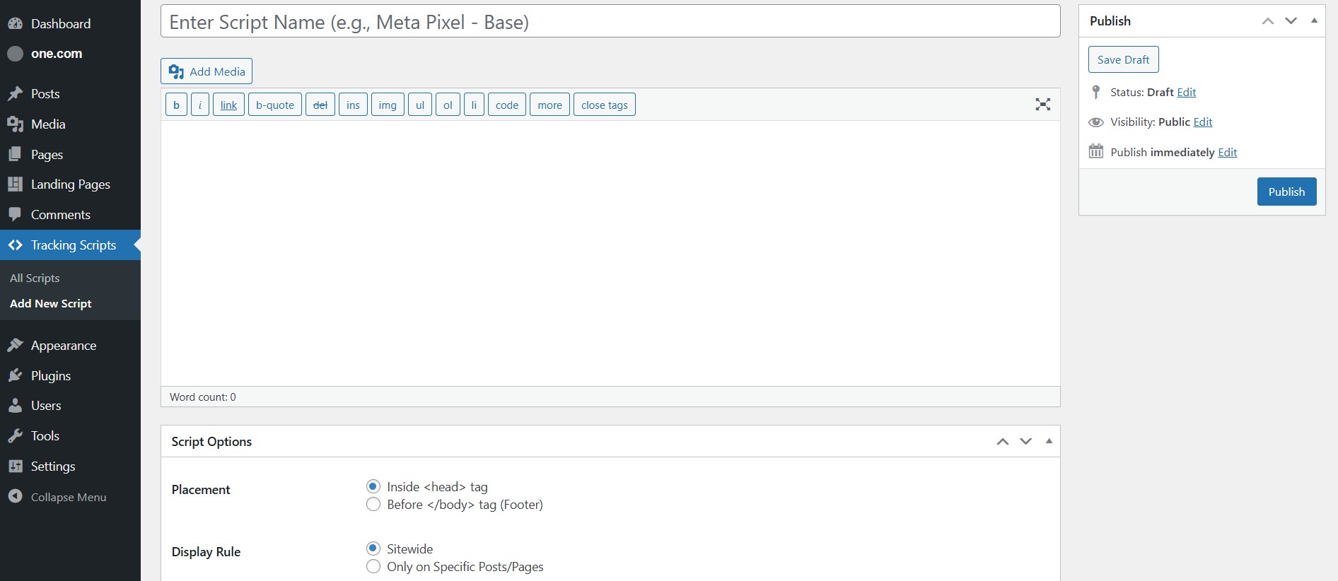 - Open the « Tracking Scripts » menu in the WordPress dashboard to add and manage tracking scripts.