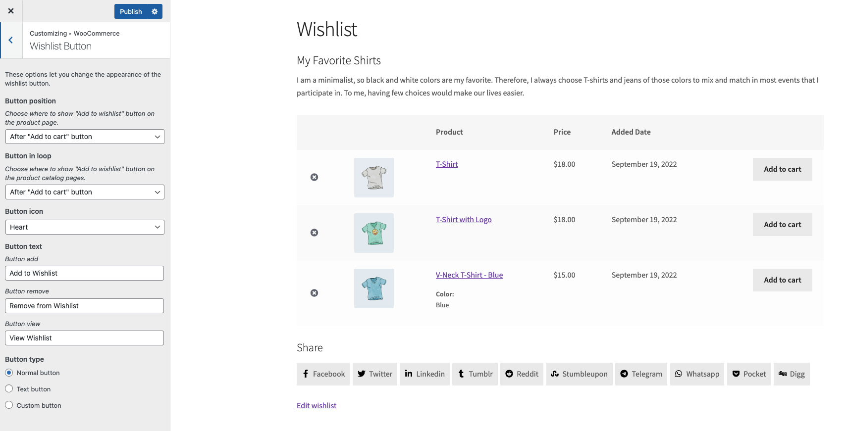 - Customize the wishlist page and buttons in an easy-to-understand manner.