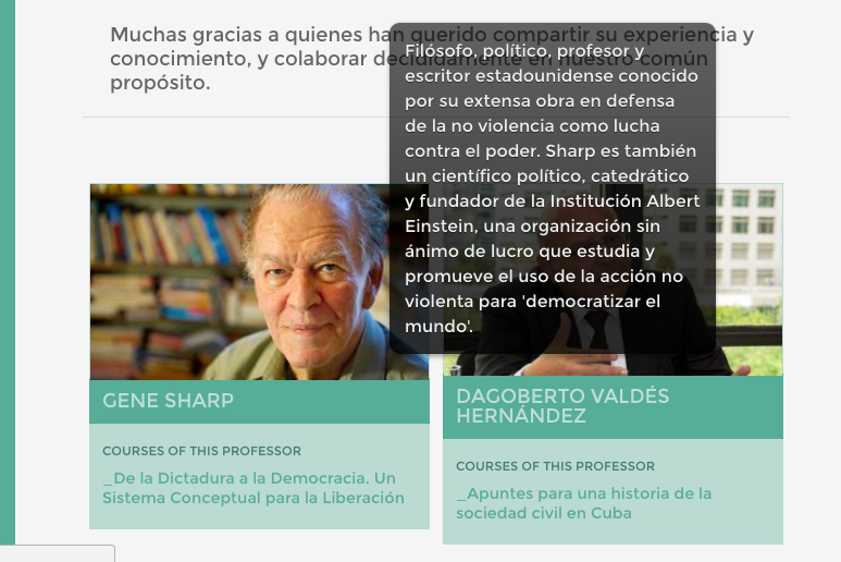 ‘tax’ => ‘cat’, //’tag’ or ‘cat’'progress' => 1, 'my' => 1, 'q' => -1, //quantity 'iclass' => 'thumbnail'The main argument is SHOW, it decides what to show. It has one of these values: f (for shows only filter), p (for shows only the portfolio of courses), a (for show the authors, it means, the professors), and al (for shows a list of courses per professor). For example:
