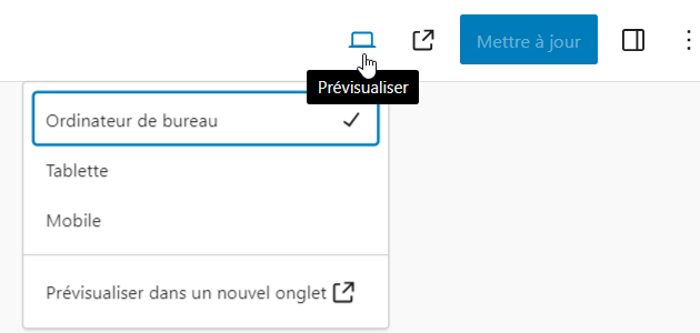 Les trois premières options permettent d’avoir un aperçu instantané de la publication ou du site, à différentes tailles d’écran, tout en restant dans la fenêtre de l’éditeur.