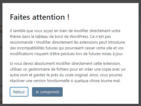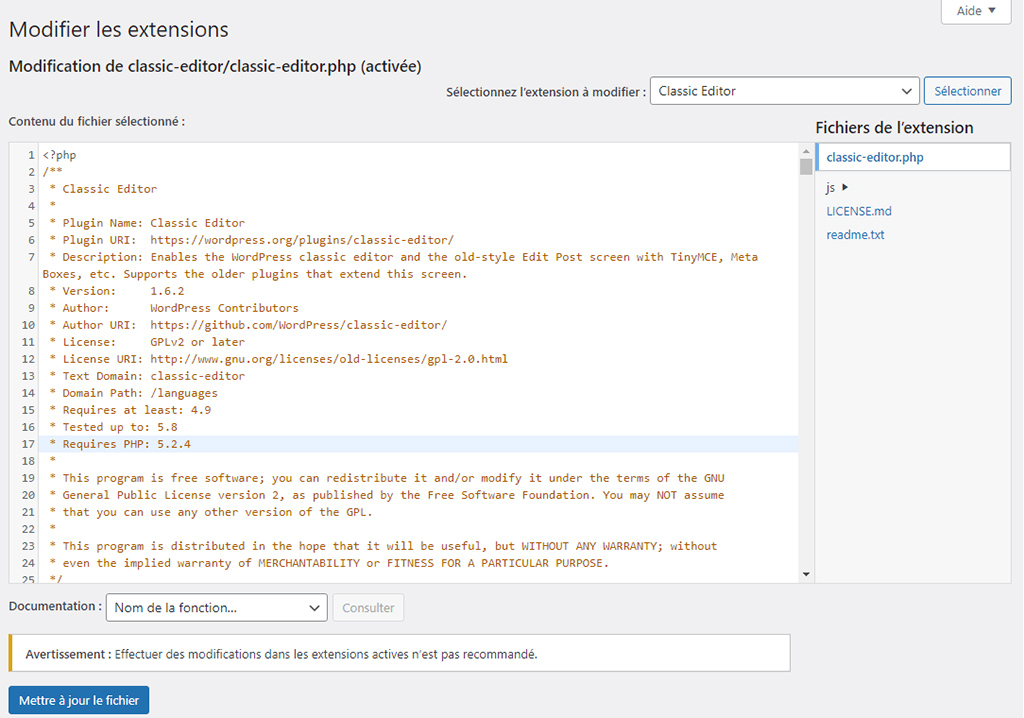 Soyez très prudent si vous modifiez un fichier d’une extension active. L’éditeur d’extension ne fait aucune copie de sauvegarde. Si vos modifications génèrent une erreur qui fait planter votre site, vous ne pourrez pas utiliser à nouveau l’éditeur pour la corriger. Si cela vous arrive, connectez-vous en FTP pour téléverser une sauvegarde fonctionnelle de l’extension ou pour renommer le nom du dossier de l’extension dans le sous-répertoire /wp-content/plugins/ ce qui désactivera l’extension. En savoir plus dans la FAQ de dépannage.