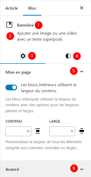 Dans les réglages du bloc, vous trouverez tout d’abord le nom du bloc suivi d’une brève description puis diverses sections de réglages qui varient d’un bloc à l’autre.