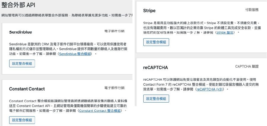 像是:Sendinblue、Constant Contact 可整合成電子報訂閱表單;Stripe 可製作購物流程表單;reCAPTCHA 可保護表單,避免惡意灌水。