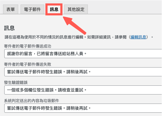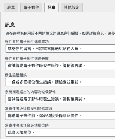 也可編輯各種通知訊息,像是:成功收到表單訊息、必填欄位未填寫、輸入資料不正確等 .. 通知,以免費外掛來說,各項細節功能都十分齊全。