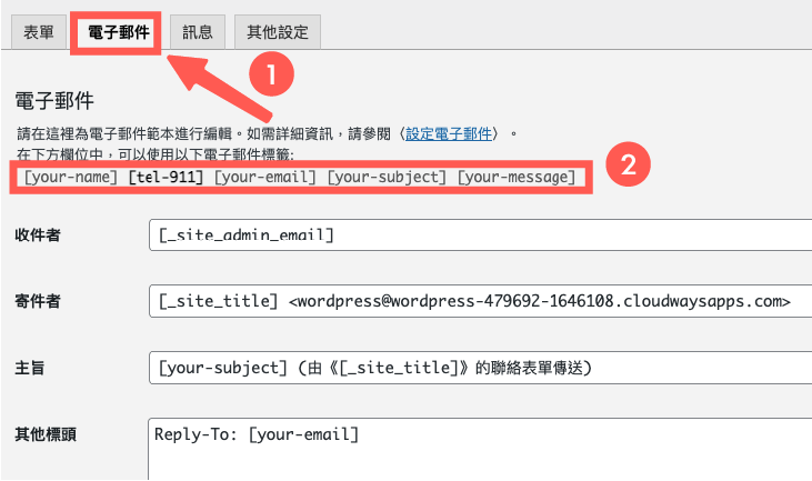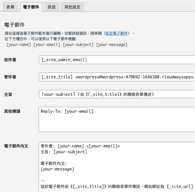 Contact Form 7 可設定將此份表單接收的資料,傳送到 Email ,也能夠自由填寫電郵模版內容。