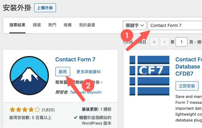 前往 WordPress 後台,外掛 > 安裝外掛,搜尋 Contact Form 7 安裝+啟用。
