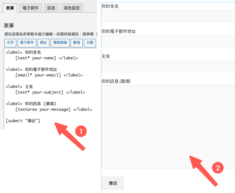 進入表單製作頁面,會看見 Contact Form 7 已自動幫我們填好基本問題 CSS 字段 ,製作出一個基本的聯絡表單。