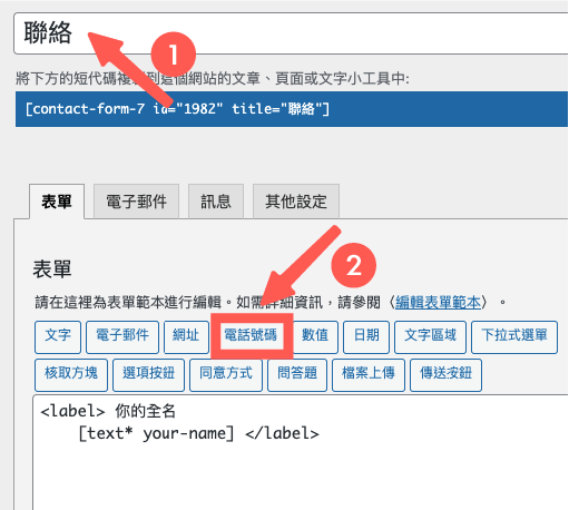 使用 Contact Form 7 過程中,是非視覺化設計模式,在新增欄位時會出現許多程式碼,不過可以隨時儲存檢視表單範本,來觀察表單呈現視覺。
