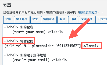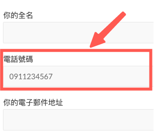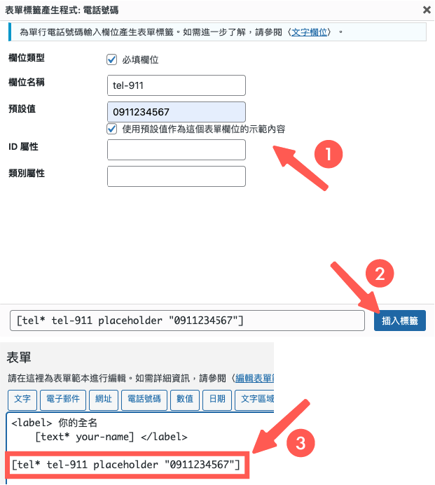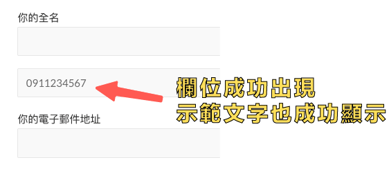小備註:「*」為必填指令,「 tel-911 」為欄位名稱,「 placeholder “0911234567” 」為預設(示範)文字。