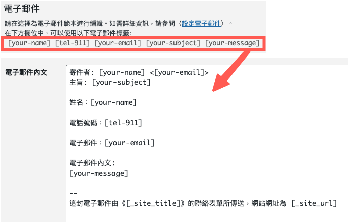 往下,我們可以利用外掛提供的標籤,修改電子郵件模版內容,新增更多表單資訊。