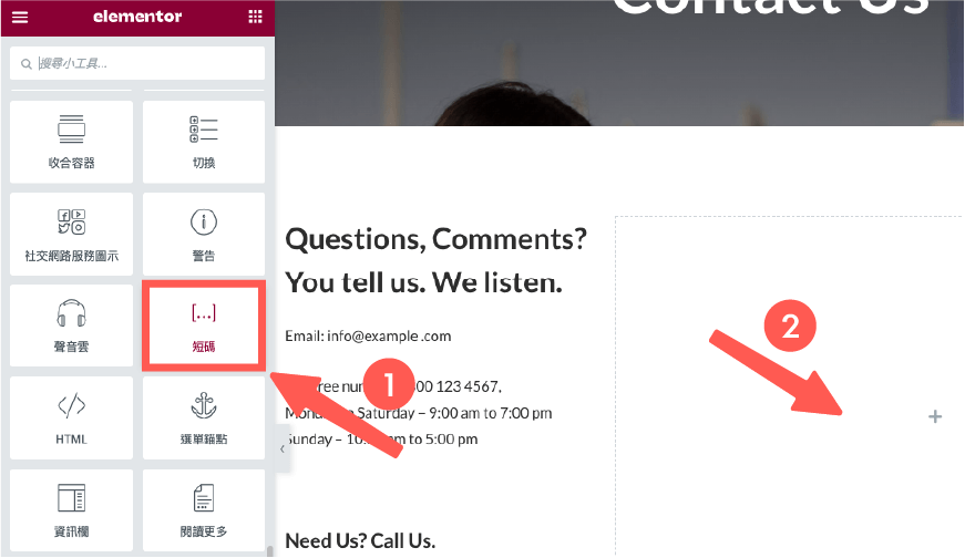 不管是使用哪款 頁面編輯器,只要前往頁面設定,使用短代碼小工具,貼上表單代碼即可,此處我以 Elementor 進行示範。更多 Elementor 基礎教學。
