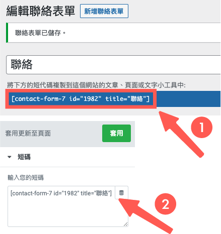 接著,在表單編輯頁面,我們可以找到表單短代碼複製,並在 Elementor 的短碼小工具,貼上表單代碼,儲存更新頁面。