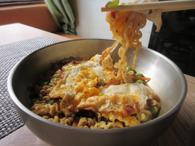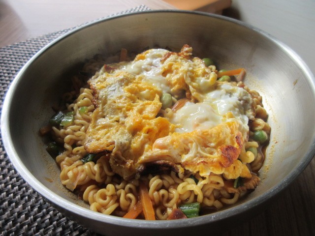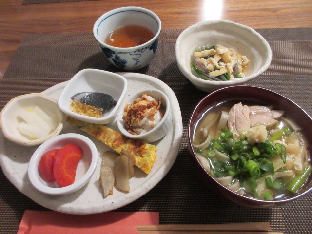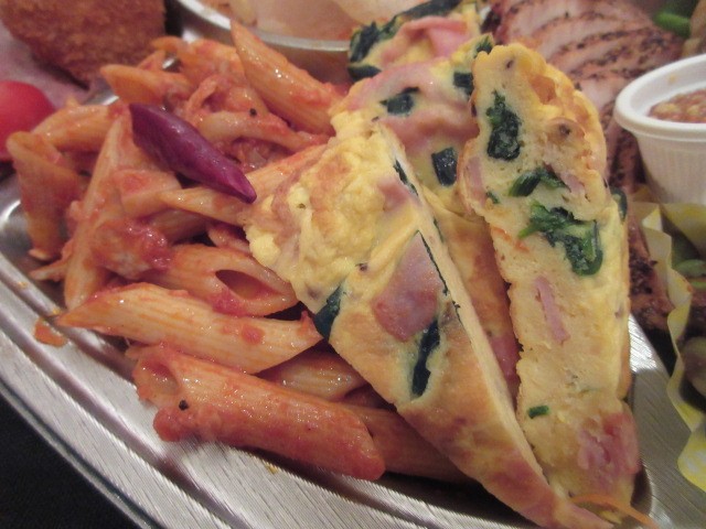 ツナとキノコのペンネアラビアータ、ベーコンとほうれんそうのオムレツ。