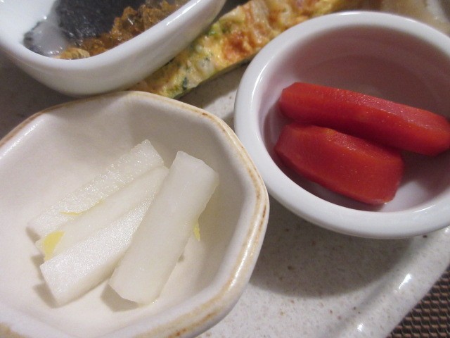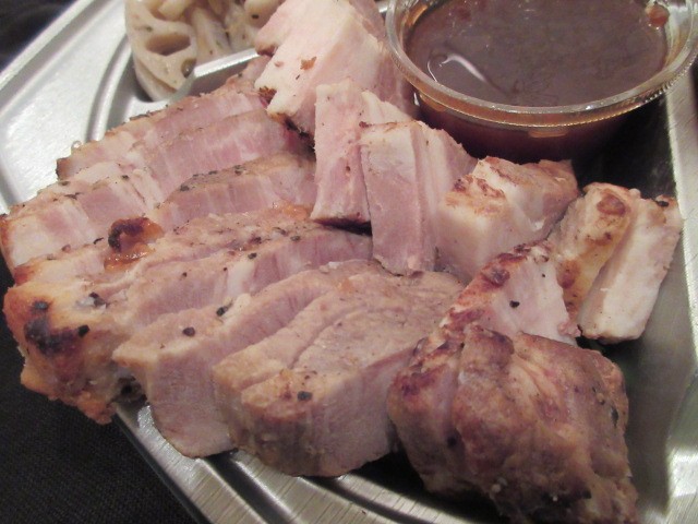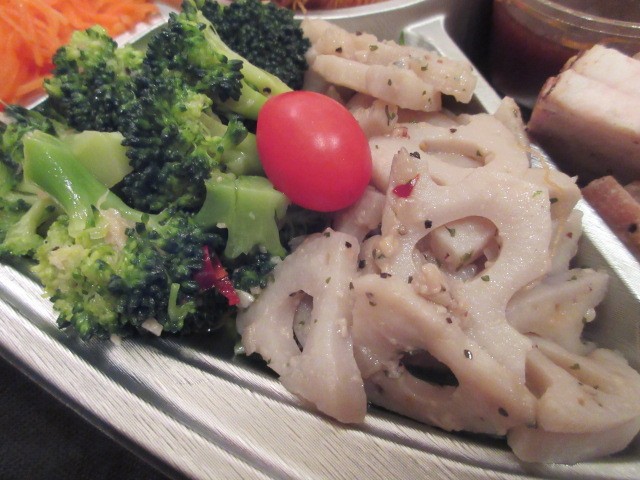 岩手県産杜仲茶豚のローストポークはバラ肉チャーシューみたいでおいしい!野菜料理も充実です。ブロッコリーのガーリックマリネ&ペペロンレンコン、人参のレモンラぺ、金柑の甘煮、枝豆のスパイシー和え。お肉料理の合間に食べるとさっぱりしていいですね~。