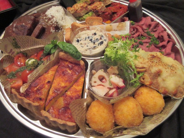 約43センチ×32センチのオードブル皿に、いろんなお料理がぎっしりと盛り付けられています。メニューが書かれた紙は入っていなかったので、わかる範囲で書きます。間違えていたらすみません。
