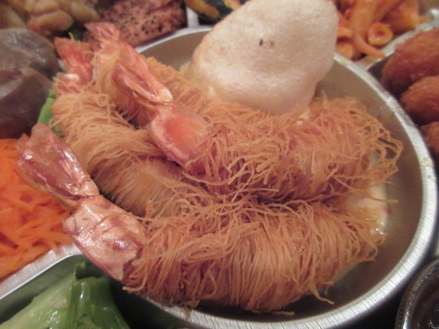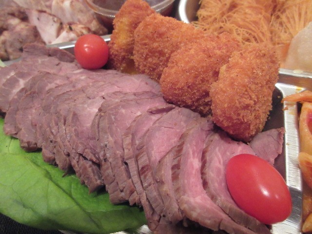 カダイフ巻きの海老マヨは、パリサクのカダイフ(春雨みたいな食材)と、ぷりぷりの海老に、甘酸っぱいマヨソースが絶品です。国産牛のローストビーフはしっとりして旨みが濃い。隣の三角のはカマンフライです。
