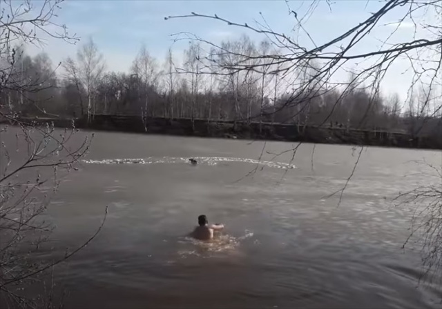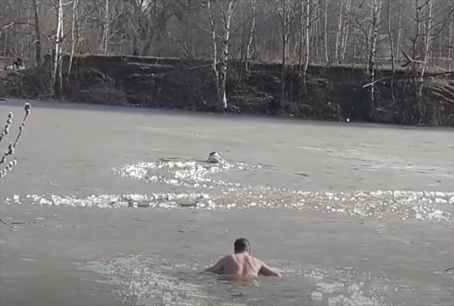 凍った川にはまってしまい、身動きがとれなくなっていたワンコ。そんなワンコを助けるべく、ある一人の男性が極寒にもかかわらず裸で救助に向かいました。
