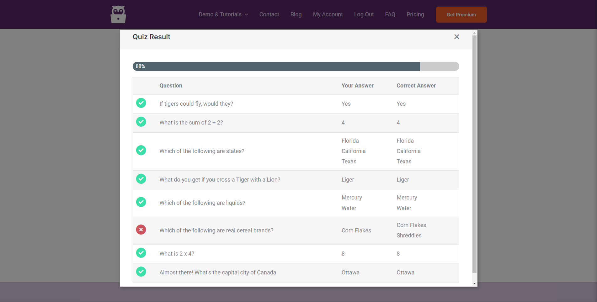 Your users can view all of their quiz results. You can also view all of your user’s quiz results in the admin area.