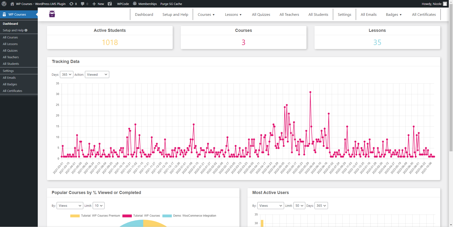 Built-in analytics that include lessons viewed, popular courses and most active students.