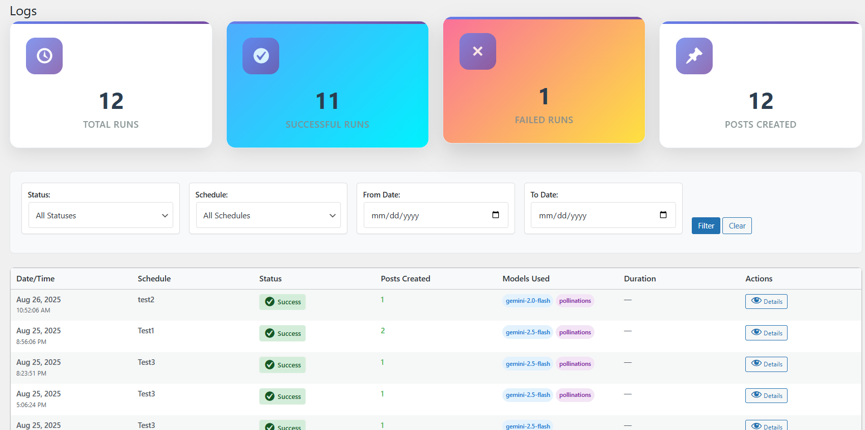 Failed runs are logged with error details. You can retry failed schedules manually from the Logs page. The plugin includes retry logic for temporary failures.