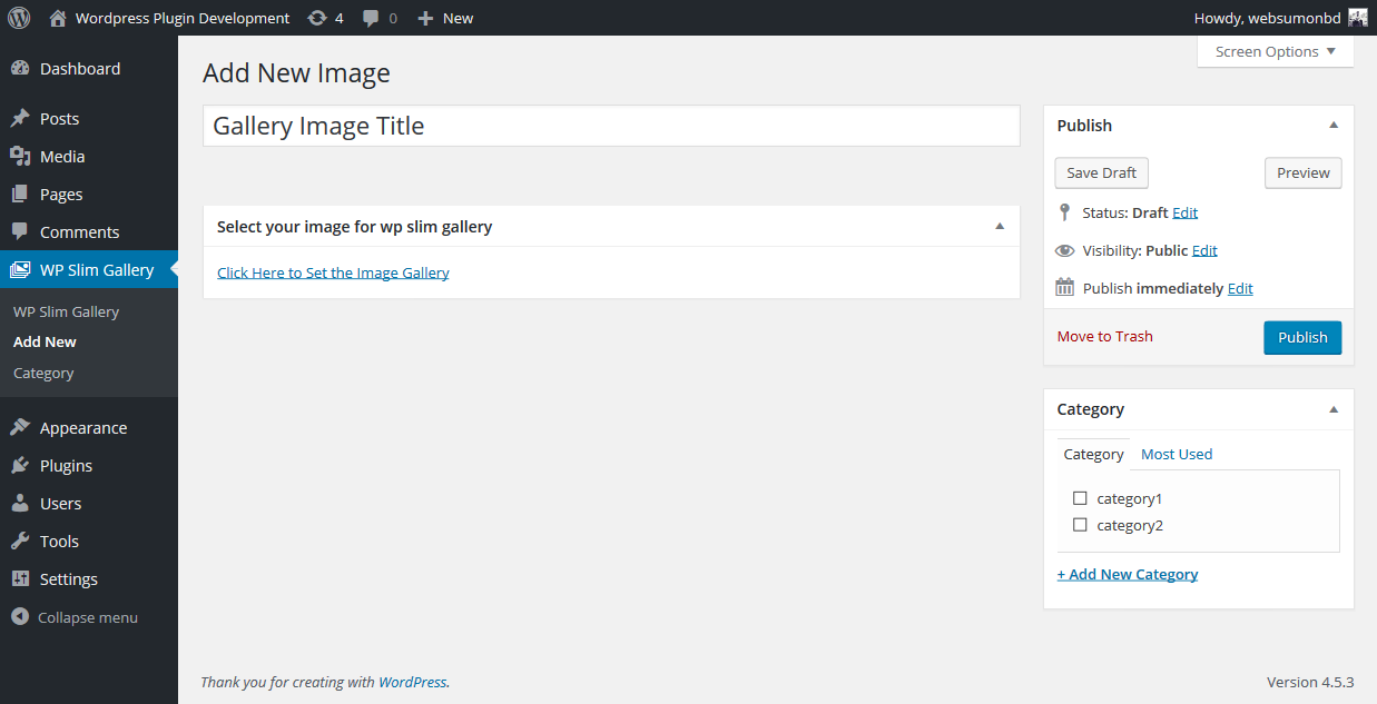 WP Slim Gallery Menu will appear in admin menu. Add gallery image and create a category. To publish the gallery use shortcode in a post or a page or a template.