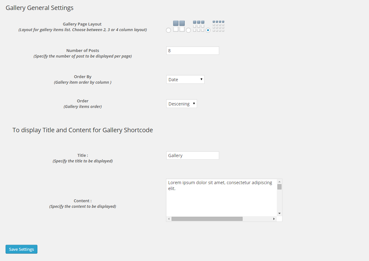 - Gallery Page Layout: This option specifies if gallery will be displayed in 2, 3 or 4 column format.