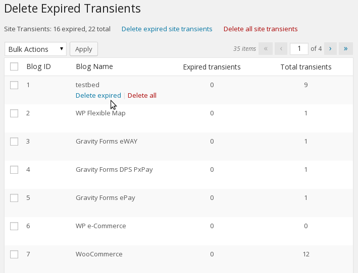 If you network activate the plugin, it operates differently. You get access to a master admin screen that allows bulk deletion of transients across multiple blogs in a network. This can also help you spot problem sites, by browsing through the list of sites and seeing if any have large numbers of transients. You can find this admin page under Settings on the multisite network admin.