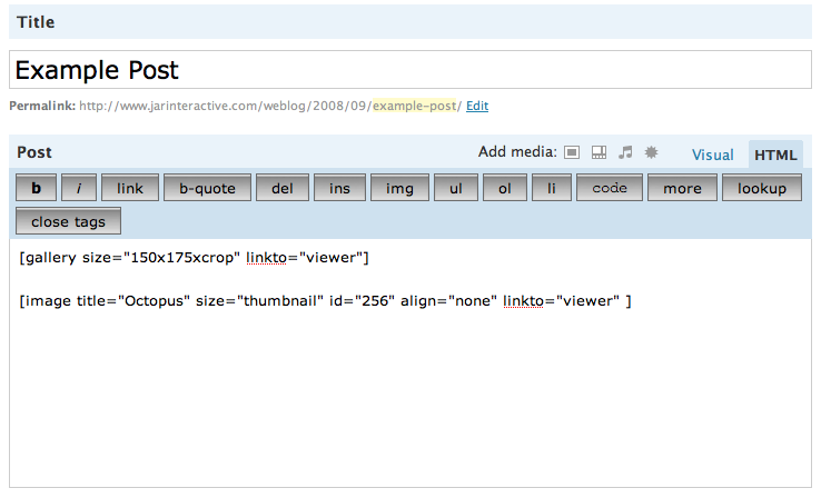 - Optional: Install a javascript viewer plugin (Ex: Lightbox, ThickBox, etc.)