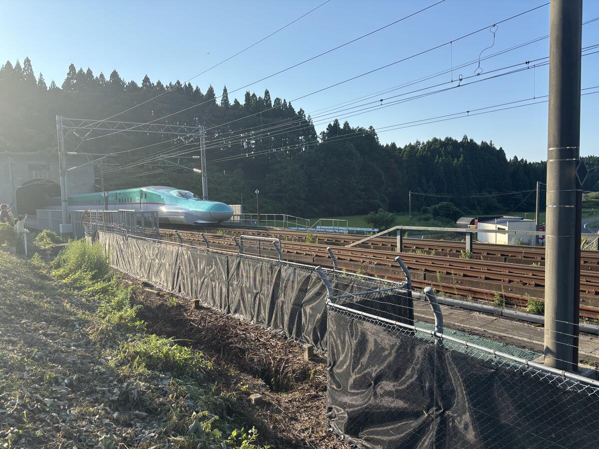 柵の向こう、この門扉の向こうに北海道新幹線の線路があります。電車が通ると風が