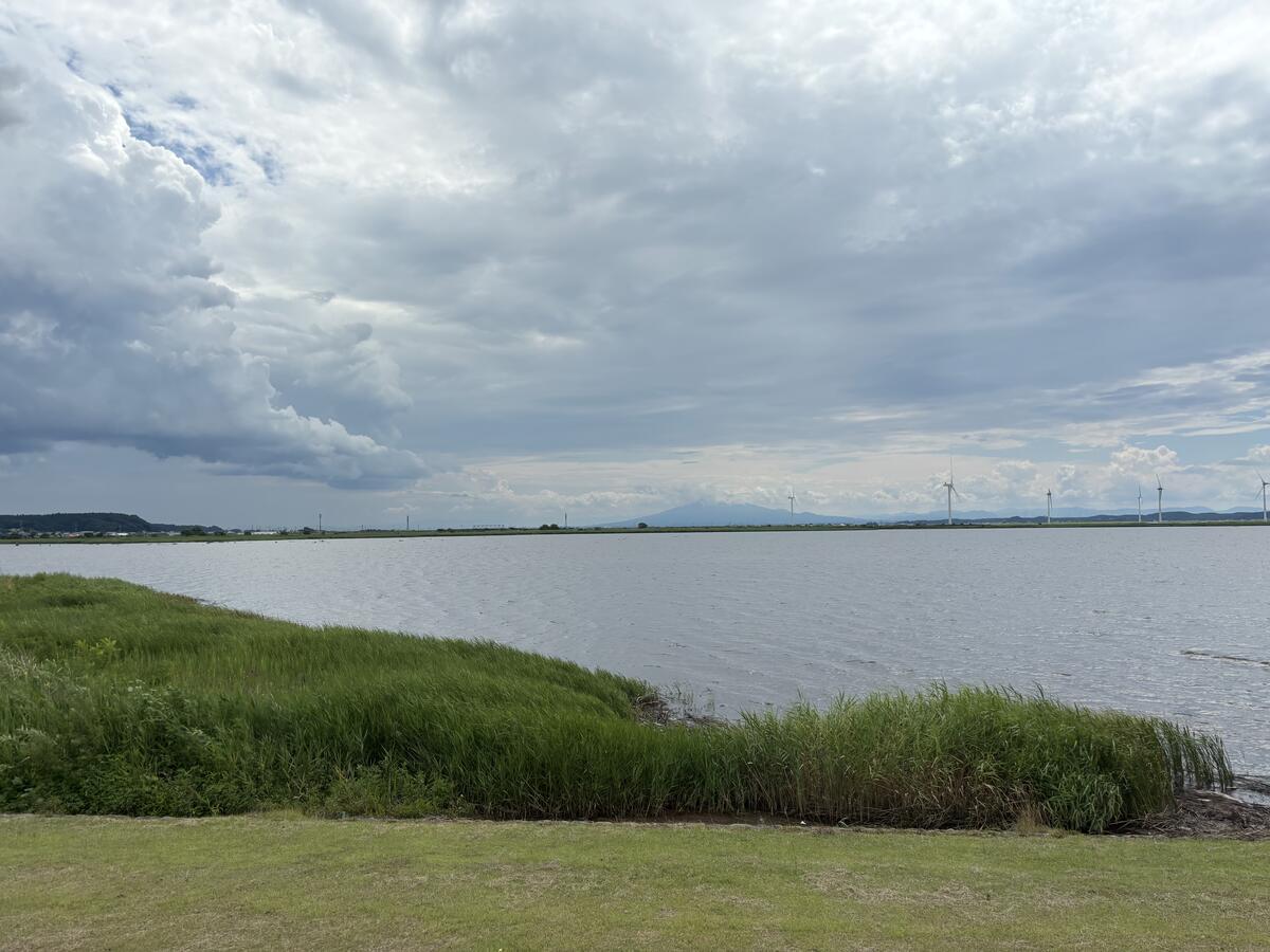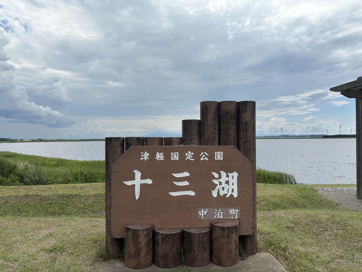 食後に…店の前の十三湖畔へ。空はちょっと曇り気味でありました。