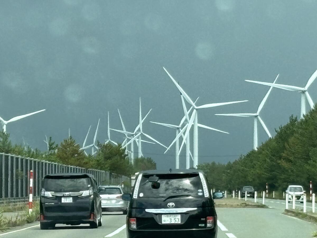 日帰り温泉への道中にて…風が強いお土地柄、あちらこちらに風車さんが…。